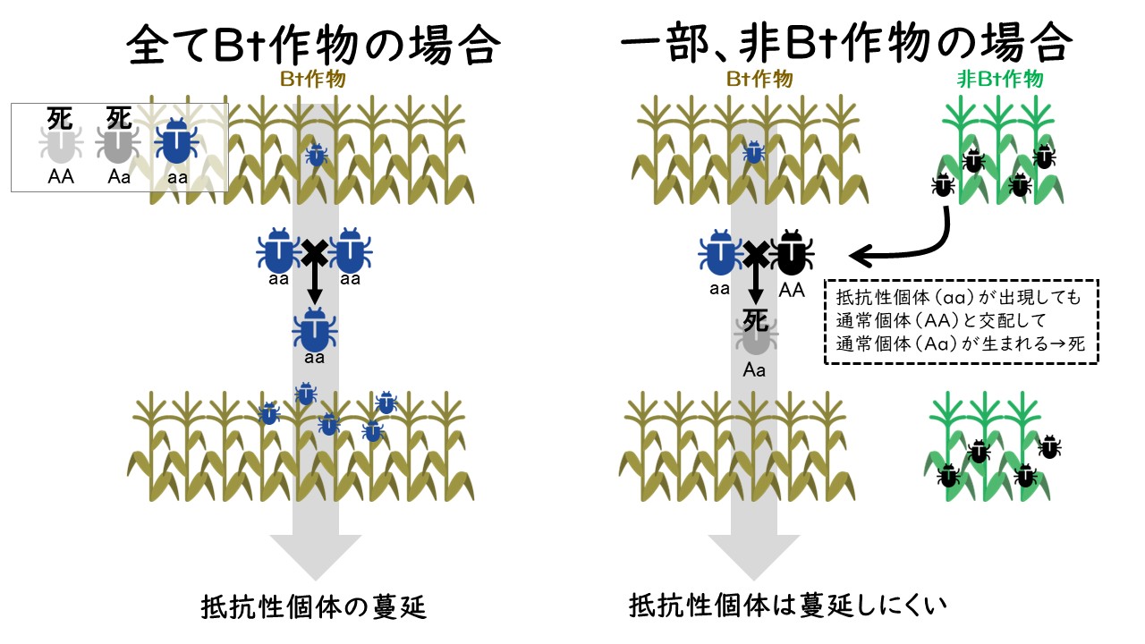 図3 避難所戦略の概要。すべてBt作物の場合、潜性ホモの抵抗性個体(青色の虫)が出現すると速やかに広がっていく。一方で、非Bt作物の避難所を作っておくと、抵抗性個体が出ても、顕性ホモの通常個体と交配し、生まれてくる個体はヘテロの通常個体なので、Bt作物で死ぬ。そのため、抵抗性個体は蔓延しにくい。