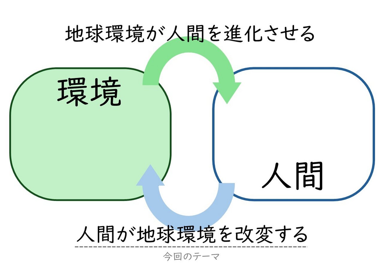 私たちの自然に対する気持ちには偏りがあり、愛する自然や嫌う自然には一貫した傾向があるようです。そして、そのような自然観の偏りは、世界の生物多様性保全を強力に推進したり、非効率にしたりします。しかし、そもそもなぜ私たちの自然に対する気持ちはそのように偏っているのでしょうか。ここからの3回の記事は、その原因を探るため、地球環境と人間の歴史に注目します(図1)。600万年の人類史のなかで、人間は環境を大きく改変してきたと同時に、その環境の影響で進化を遂げてきました。今回の記事ではまず、人間が環境に与えた影響を中心に、ごく簡単に人類史を辿ってみます。果実を食べて種子を散布するくらいの影響力しかなかった動物が、どのように惑星の改変者となるに至ったかを見ていきましょう。