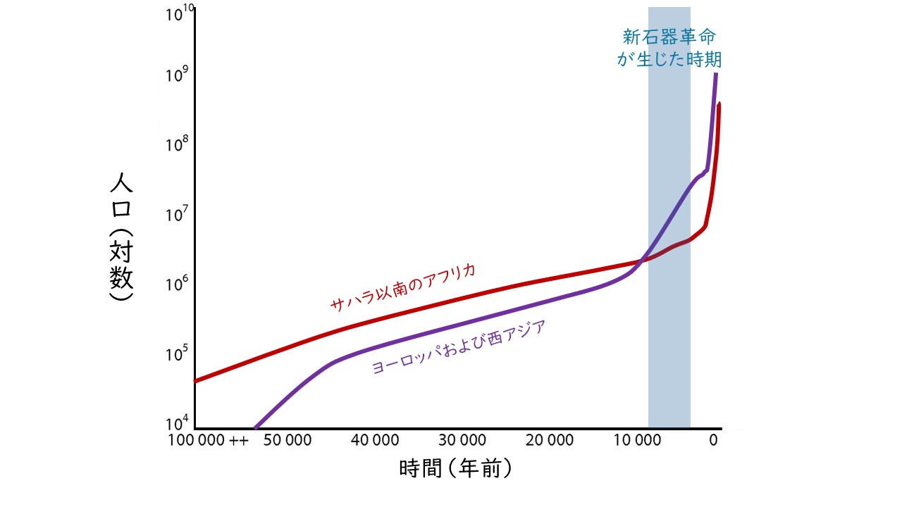 図2 新石器革命が人口に与えた影響。新石器革命(農耕が出現した時期)以後、顕著に人口が増加している。新石器革命は、西アジア、中国、インド、エジプトでまず始まり、少し遅れてサハラ以南のアフリカでも起こった。