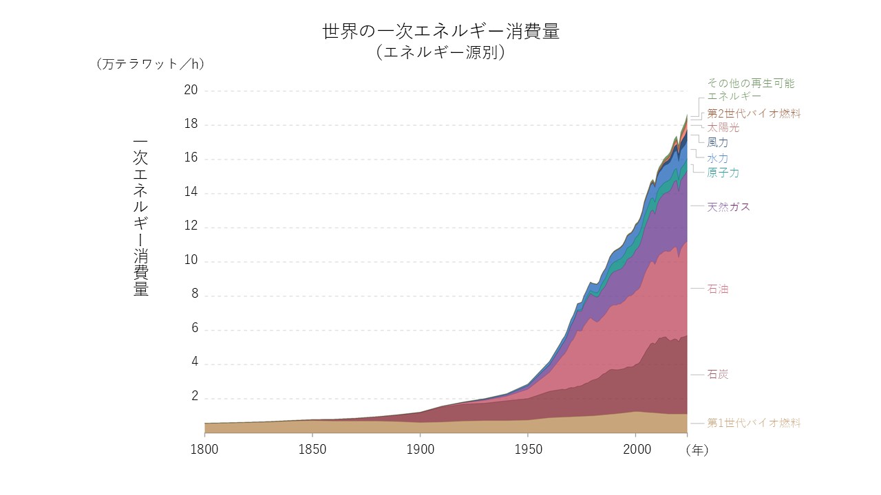 図3 Hannah Ritchie, Pablo Rosado, and Max Roser (2020) - “Energy Production and Consumption” Published online at OurWorldinData.org. Retrieved from: https://archive.ourworldindata.org/20260304-094028/energy-production-consumption.html [Online Resource] (archived on March 4, 2026)の図版“Global primary energy consumption by source”を翻訳して引用。