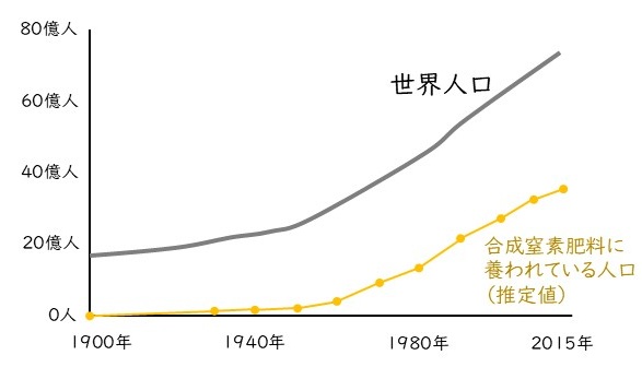 図4 Hannah Ritchie (2017) - “How many people does synthetic fertilizer feed?” Published online at OurWorldinData.org. Retrieved from: https://archive.ourworldindata.org/20260306-181537/how-many-people-does-synthetic-fertilizer-feed.html [Online Resource] (archived on March 6, 2026)の図版“World population with and without synthetic nitrogen fertilizers”をもとに作成。