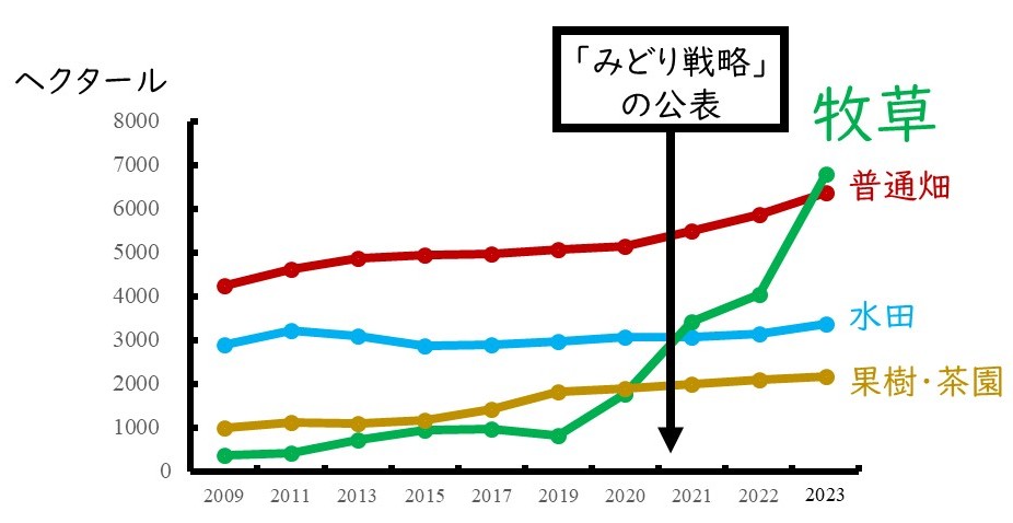行政が農政の方針を公表することで、実際に農業が変化する兆しがみえています。農水省の統計をみると、みどり戦略が公表される前後から、特に牧草の有機農地の面積が急増していることがわかります(図1)。都道府県別のデータから北海道のみで増加していることもわかります。おそらく牧草の栽培は無農薬や無化学肥料でも行いやすいので、有機転換する農家が多いのでしょう。普通畑という区分でも微増していますが、これも無農薬・無化学肥料で栽培しやすいサツマイモが牽引している可能性があります。一方で、日本の農地面積の半分以上を占める水田稲作ではほとんど増えていませんし、農薬がないと病害虫の管理が難しい果樹や野菜も増えていません。また牧草で急増しているとはいえ、これでも牧草の全面積の1%程度です。なかなか、目標達成への道は険しそうです。