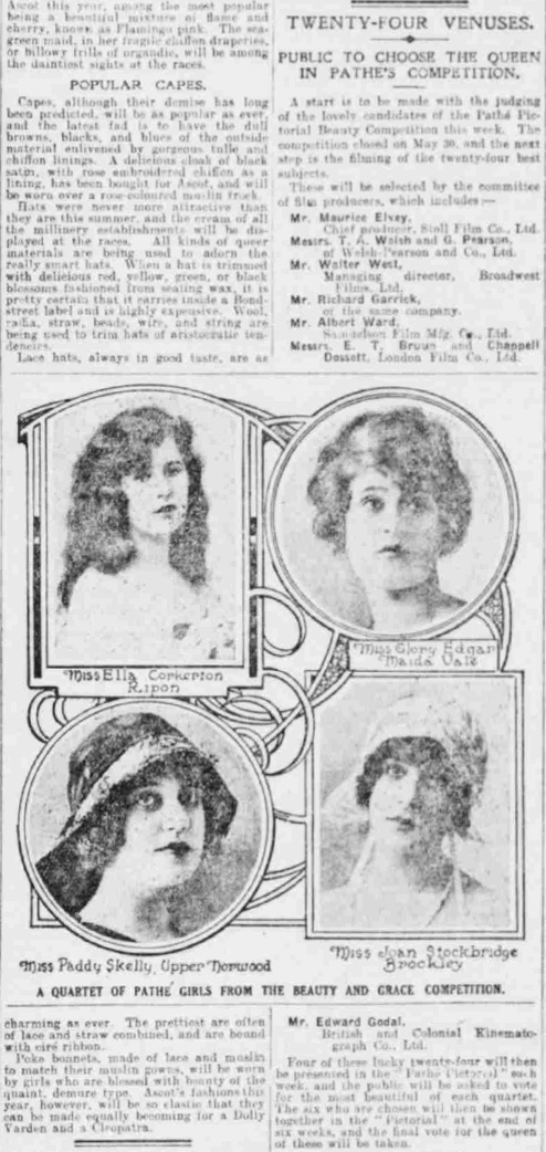 新聞社による美人コンテストは戦間期の英国において頻繁に行われていましたが、この『デイリー・エクスプレス』紙によるコンテストもその一つです。このコンテストでは、公募により選ばれた24人の候補者の中から読者投票により優勝者を決定することになっていました。記事中の写真はその24人のうちの4人です。そして優勝者に投票した読者には賞品が贈られました。