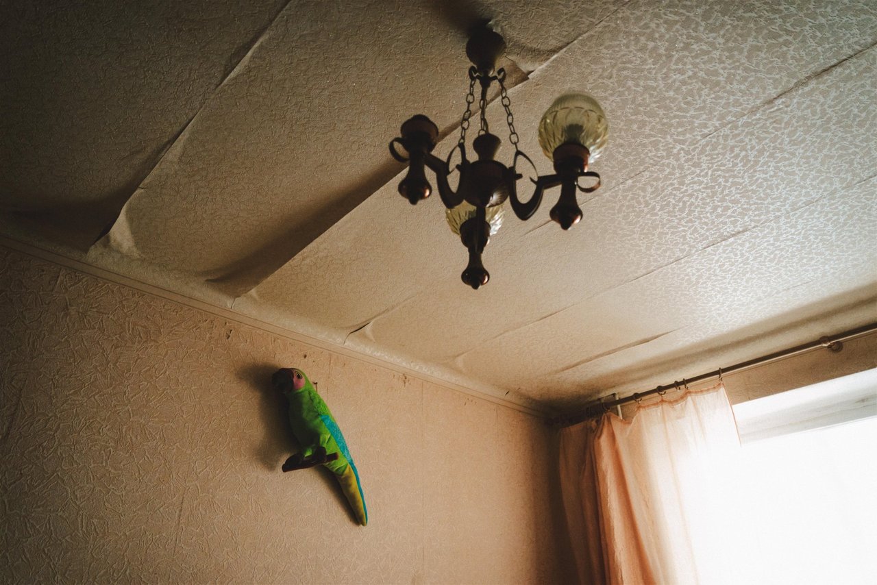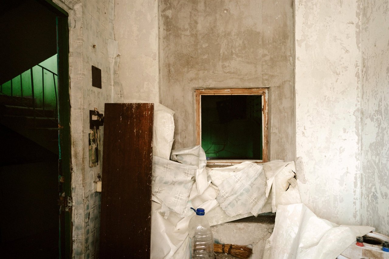 到着したのは10階建てほどのアパートだった。ソ連式のどこにでもあるような古びた建物だ。とても小さくて狭いくせに轟音を立てているエレベーターに乗って上がっていく。暗い廊下で、ローマンはポケットから鍵を取り出し、慣れた手つきでドアを開けた。部屋に電気は通っておらず、暗くて埃っぽい。土足のままでいいという。部屋に入ると廊下よりひんやりした。すぐに目が慣れてきた。部屋には、家具らしいものはほとんど残っていなかった。ベランダを改装したバルコニーの窓はガラスが割れて無くなっているところもあり、かけられたビニールシートが風で揺れている。
